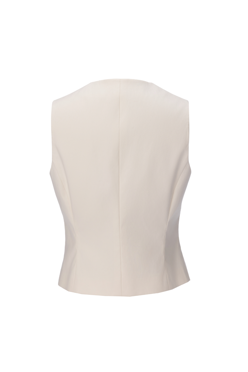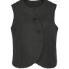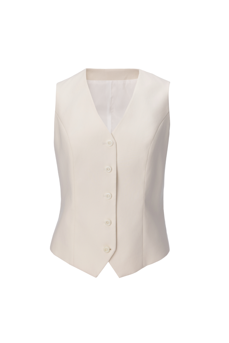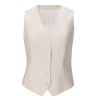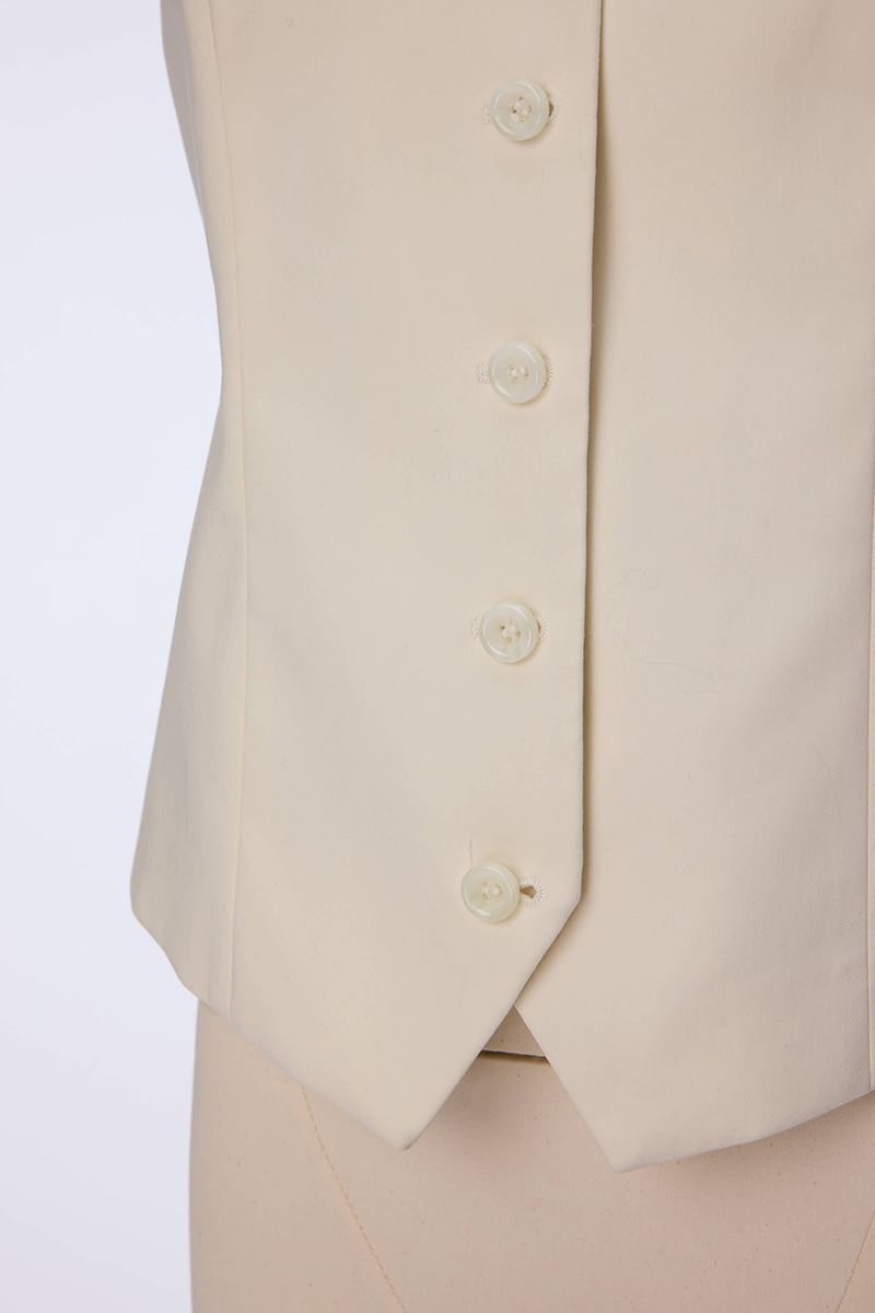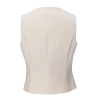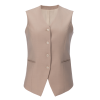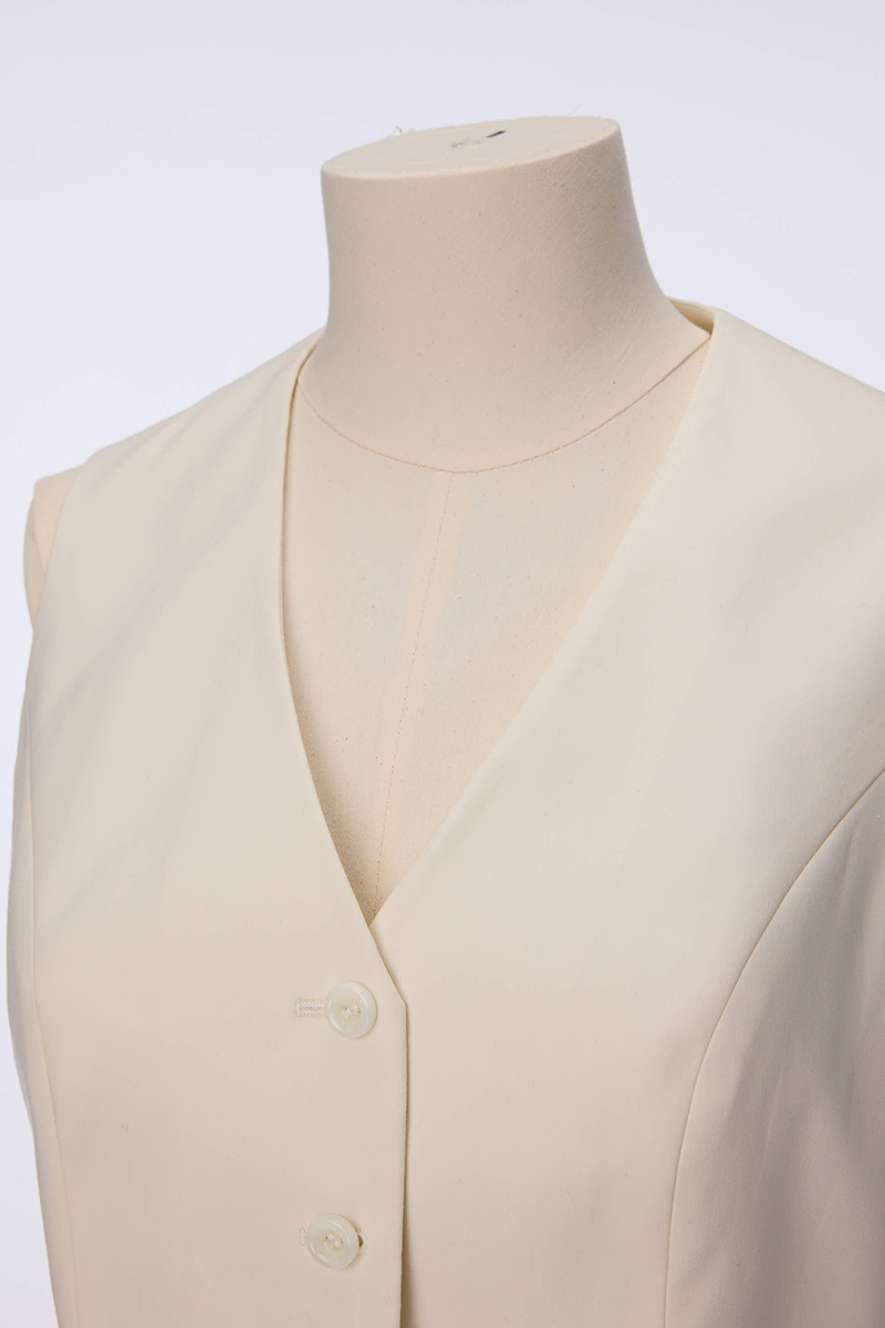 Chaleco corto para mujer de la serie D (versión internacional con hombros estrechos, largo corto, espaciado pequeño entre botones y sisas profundas), que presenta una sola fila de cinco botones, un diseño estándar sin cuello en forma de V y una construcción de ocho paneles.