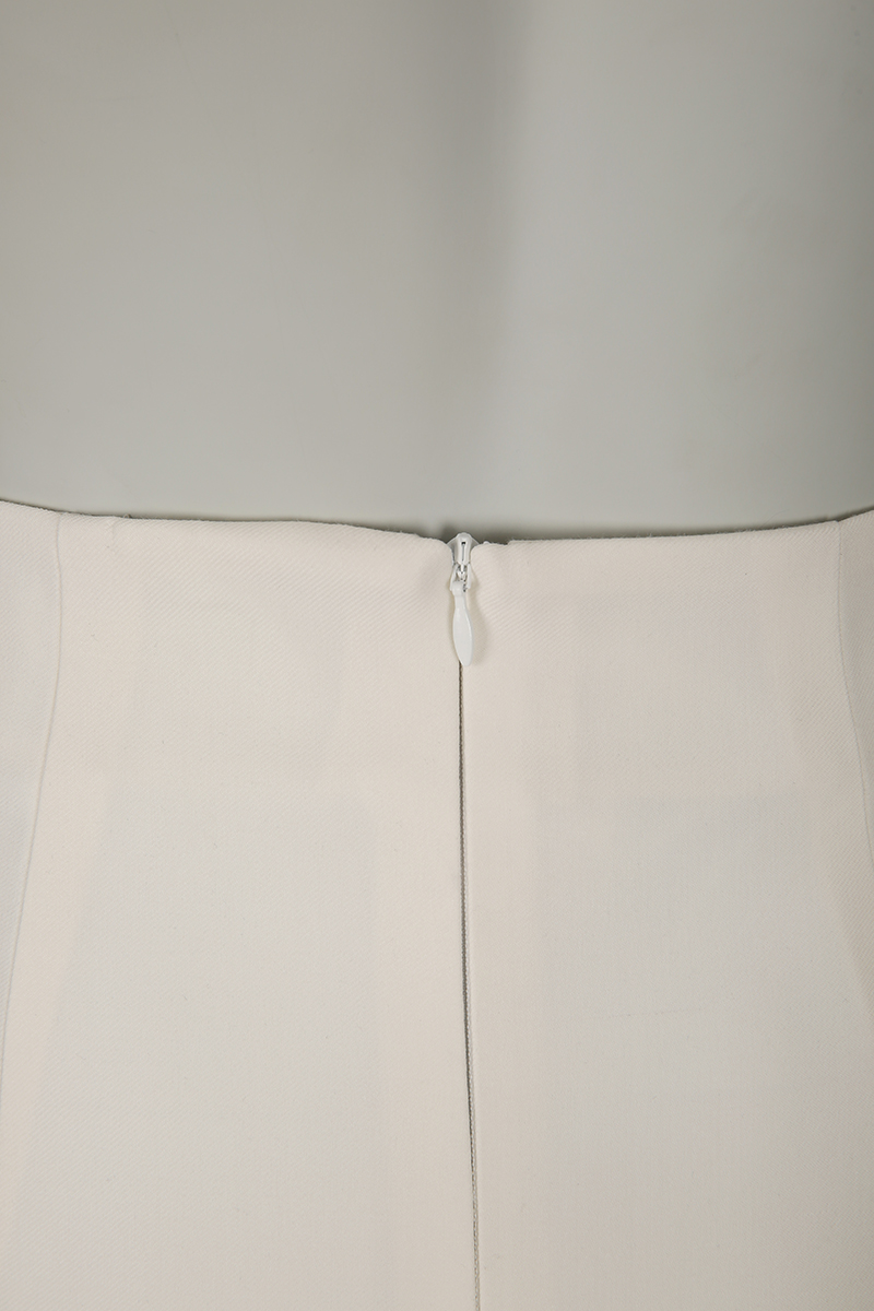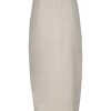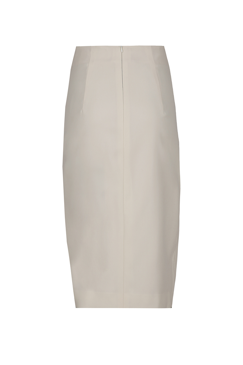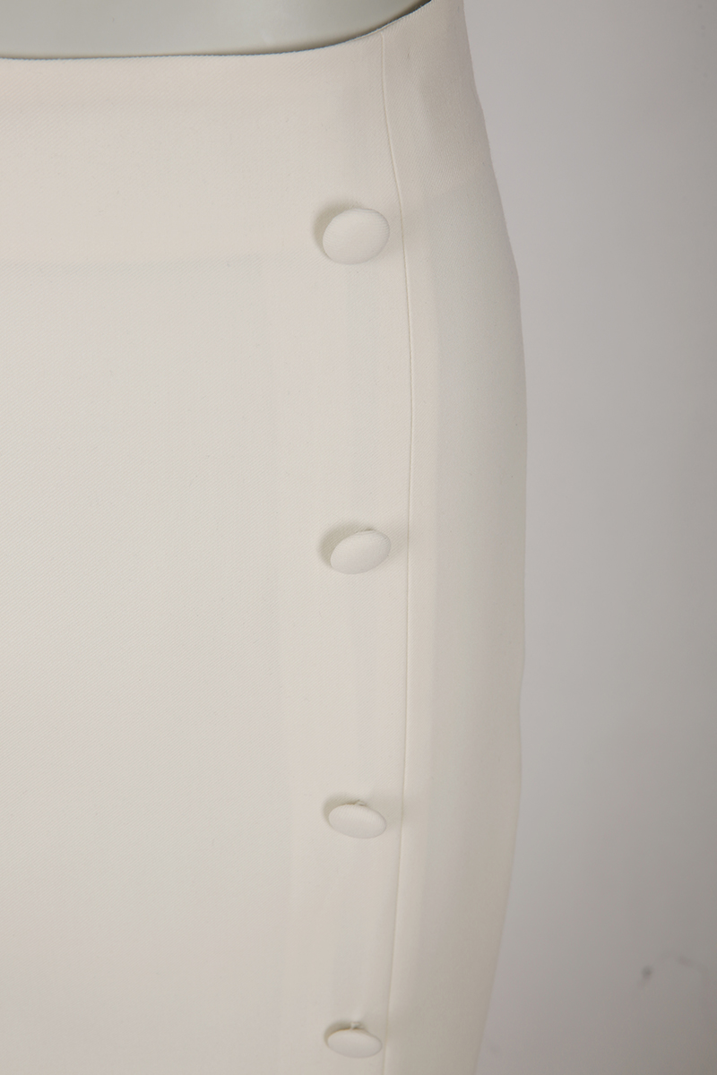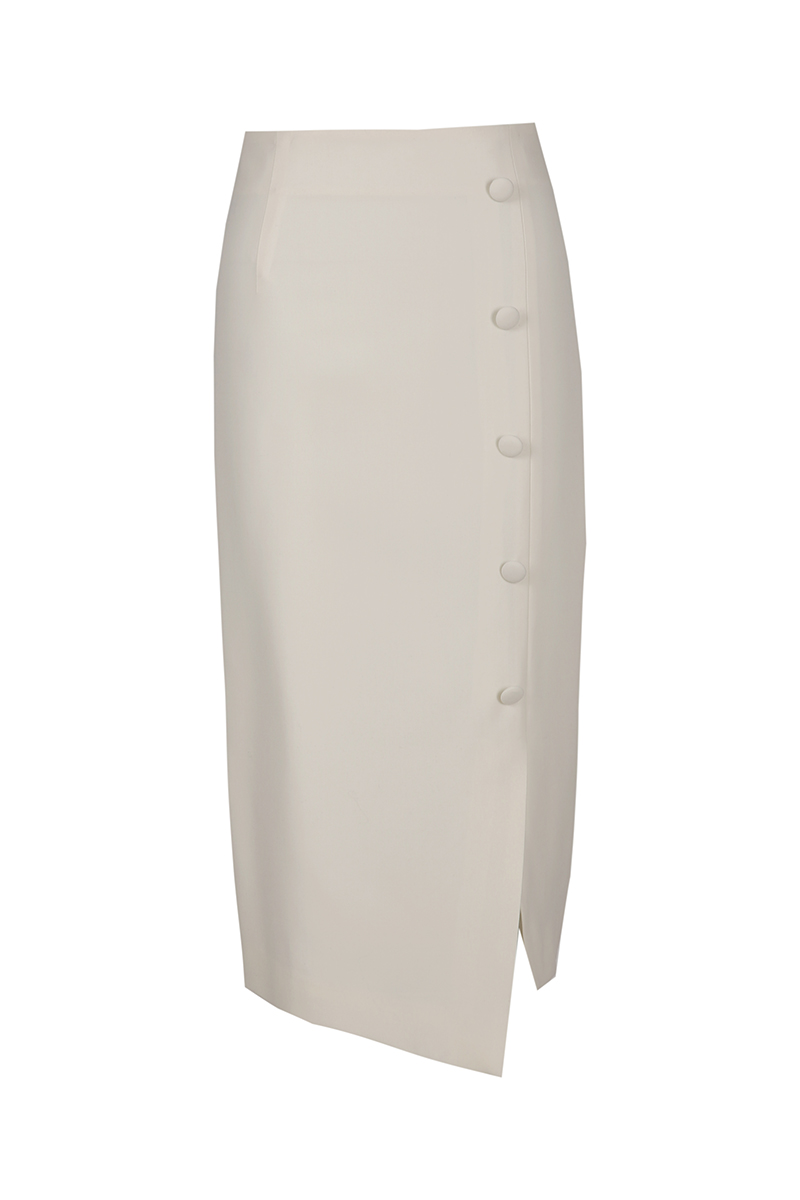 Falda larga de tubo con diseño irregular, bajo asimétrico y detalle de cinco botones en la parte delantera.