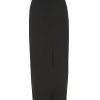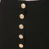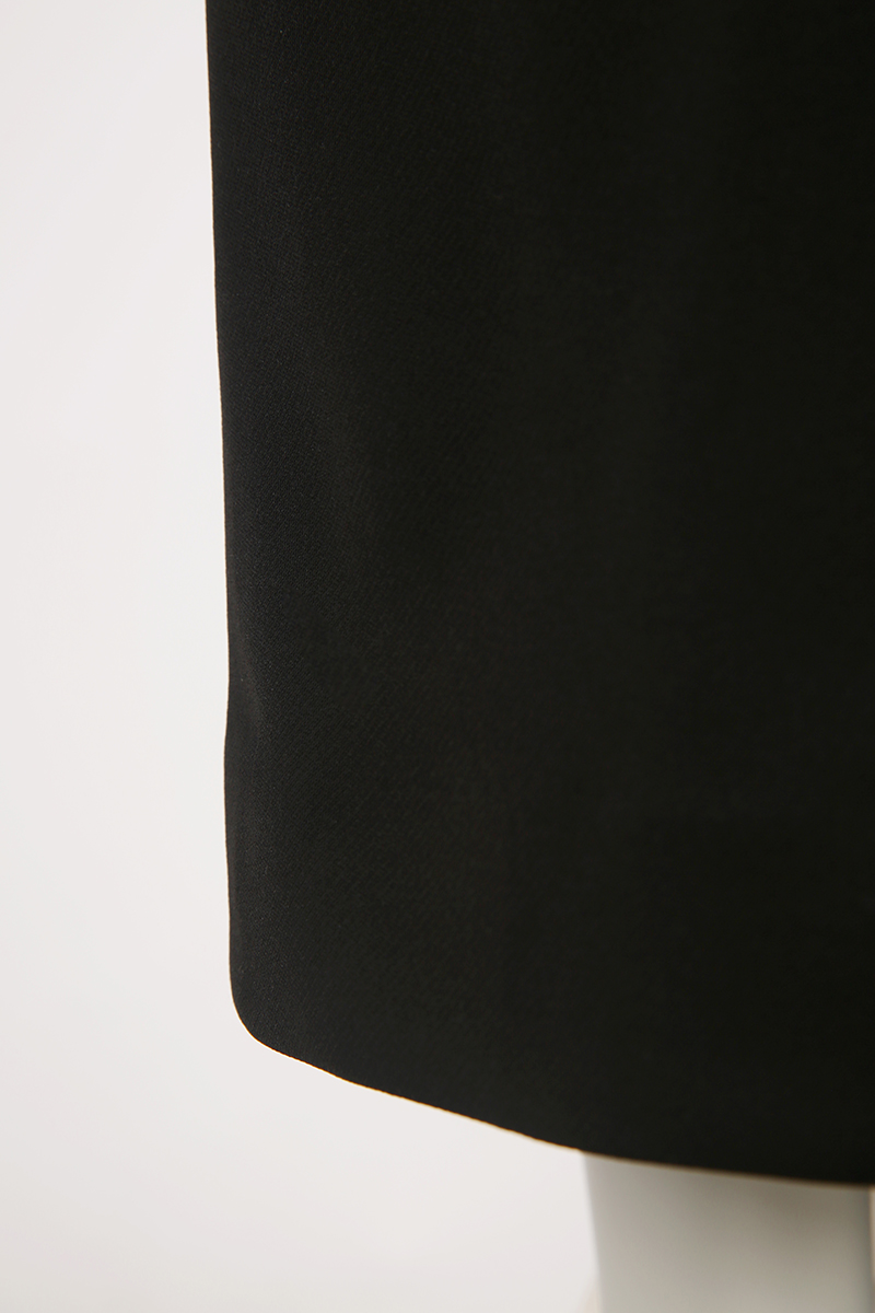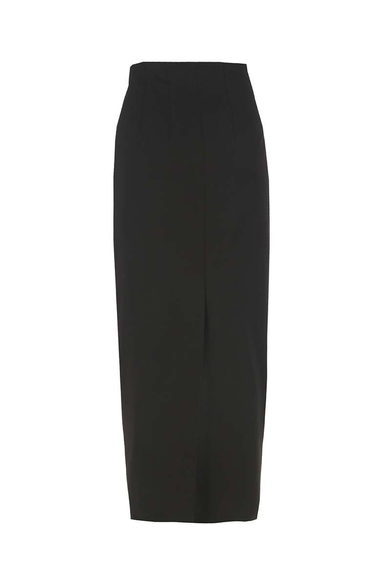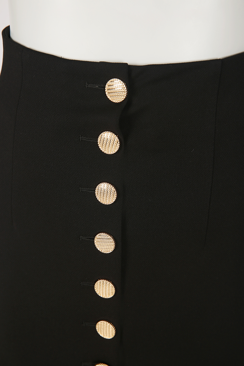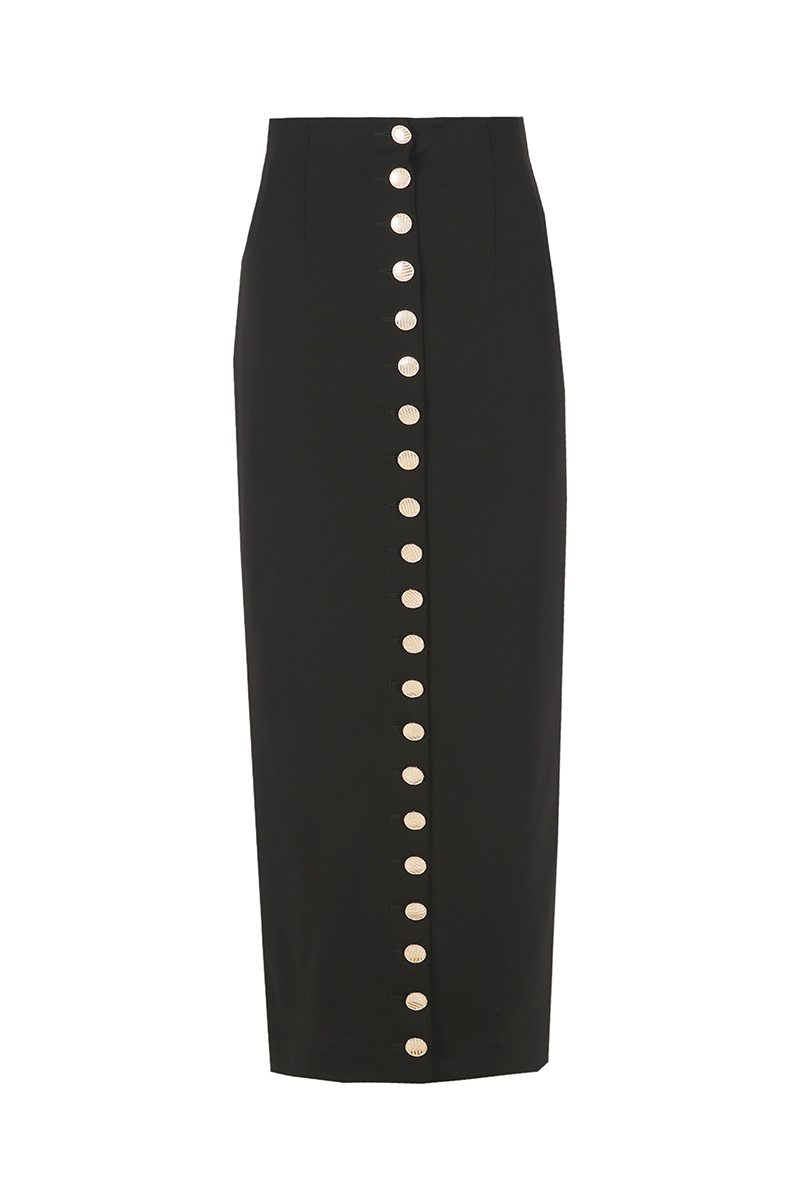 Falda tubo de cintura alta con cierre de botones frontales, pespuntes de ojo de cerradura y botones metálicos. Una sola abertura en la espalda facilita el movimiento.