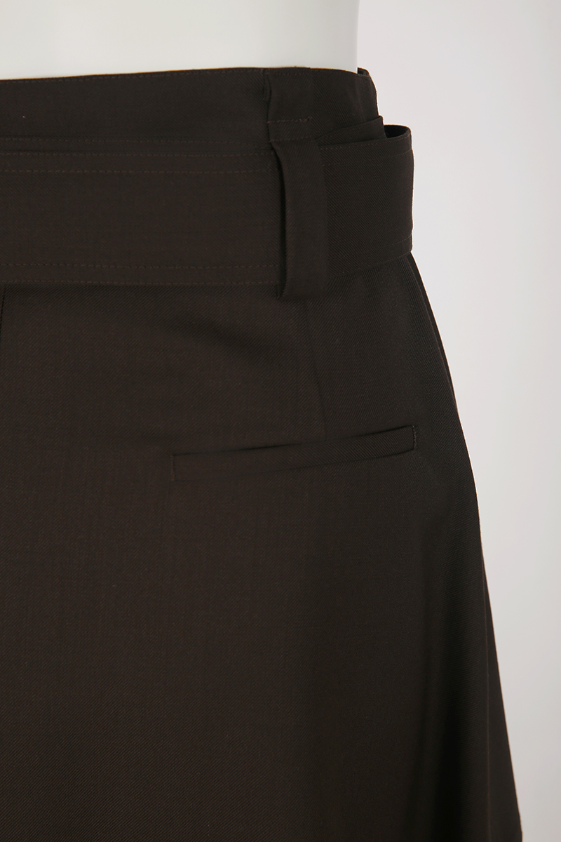 Falda evasé con cintura alta, cinturón ajustable y distintivos bolsillos de parche cuadrados con aberturas inclinadas en la parte delantera. Presenta un estilo vintage-casual.