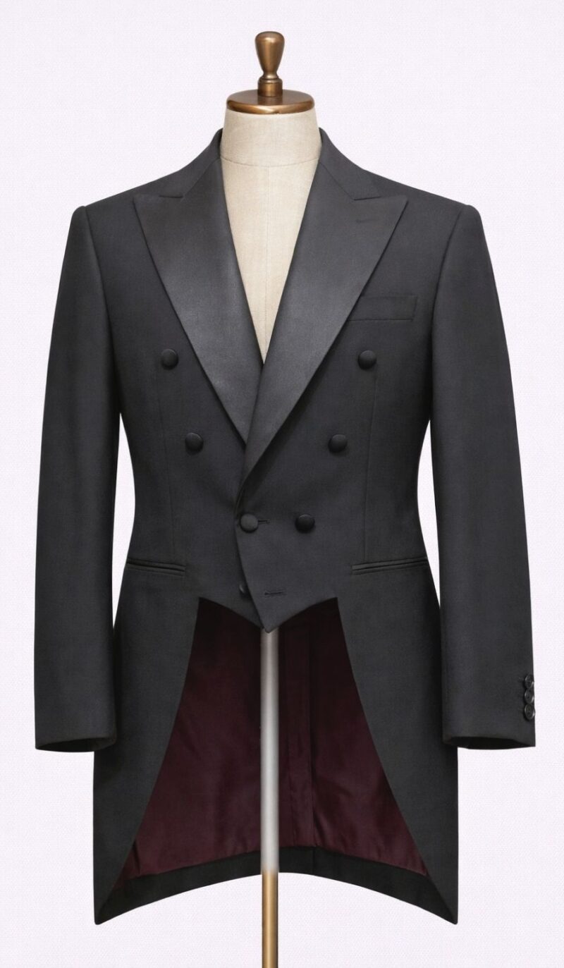 Frac negro cruzado de alta sastrería, con solapa de pico y corte estructurado que estiliza la figura. Diseño clásico de etiqueta con caída posterior alargada y forro interior en tono vino para un contraste elegante. Ideal para ceremonias y eventos formales.