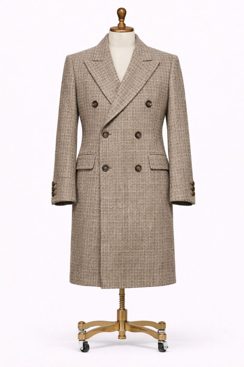 Gabardina cruzada de lana con estructura impecable y acabado refinado.