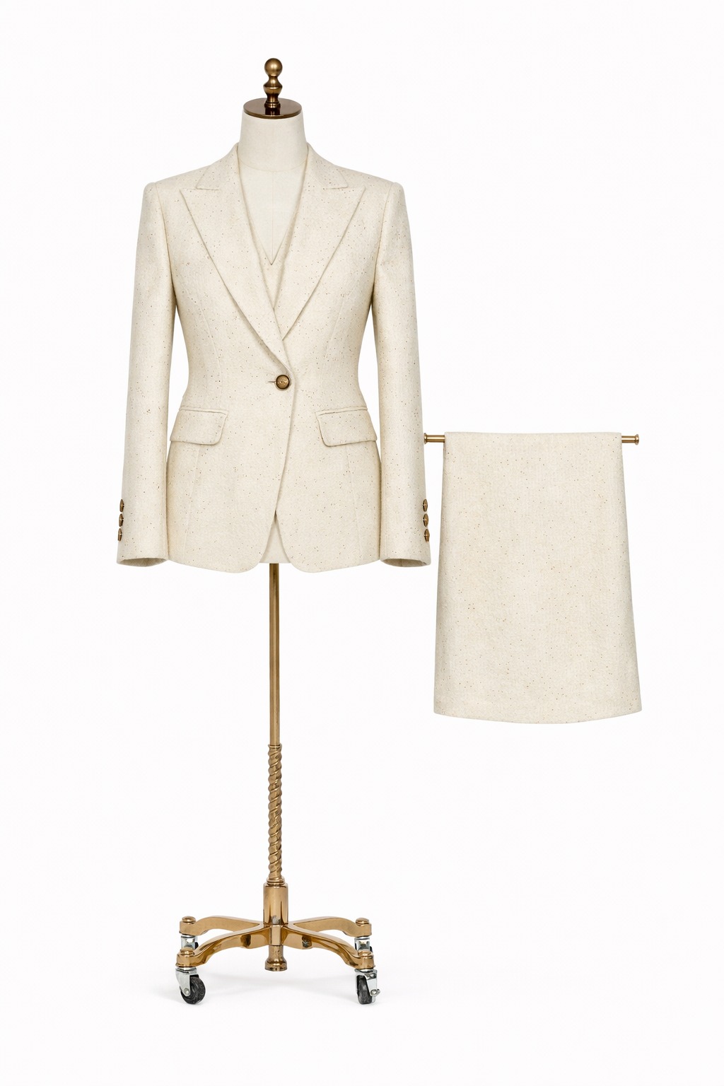 Traje crema con detalles dorados que eleva el look con un toque de lujo.