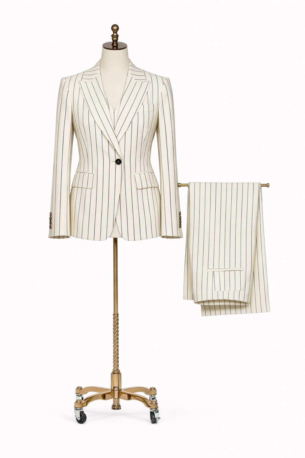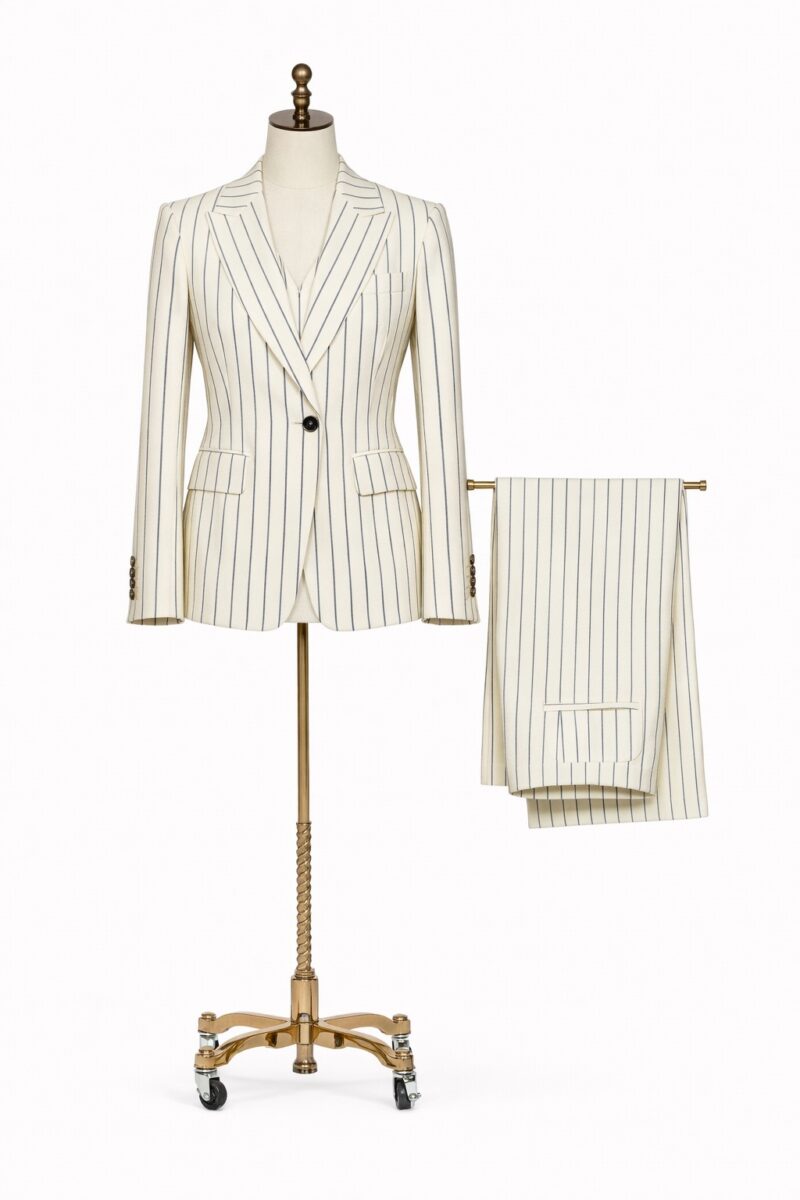 Traje crema a rayas, ligero, sofisticado y lleno de frescura.