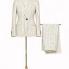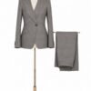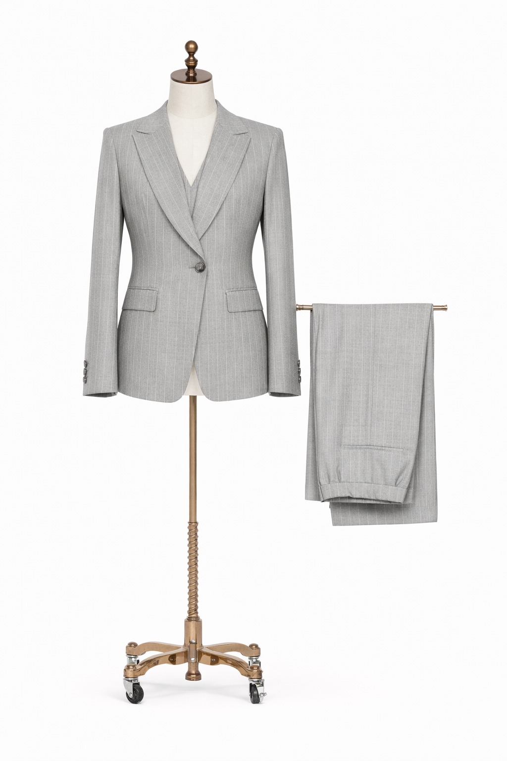 Traje gris claro a rayas con una imagen pulida y contemporánea.
