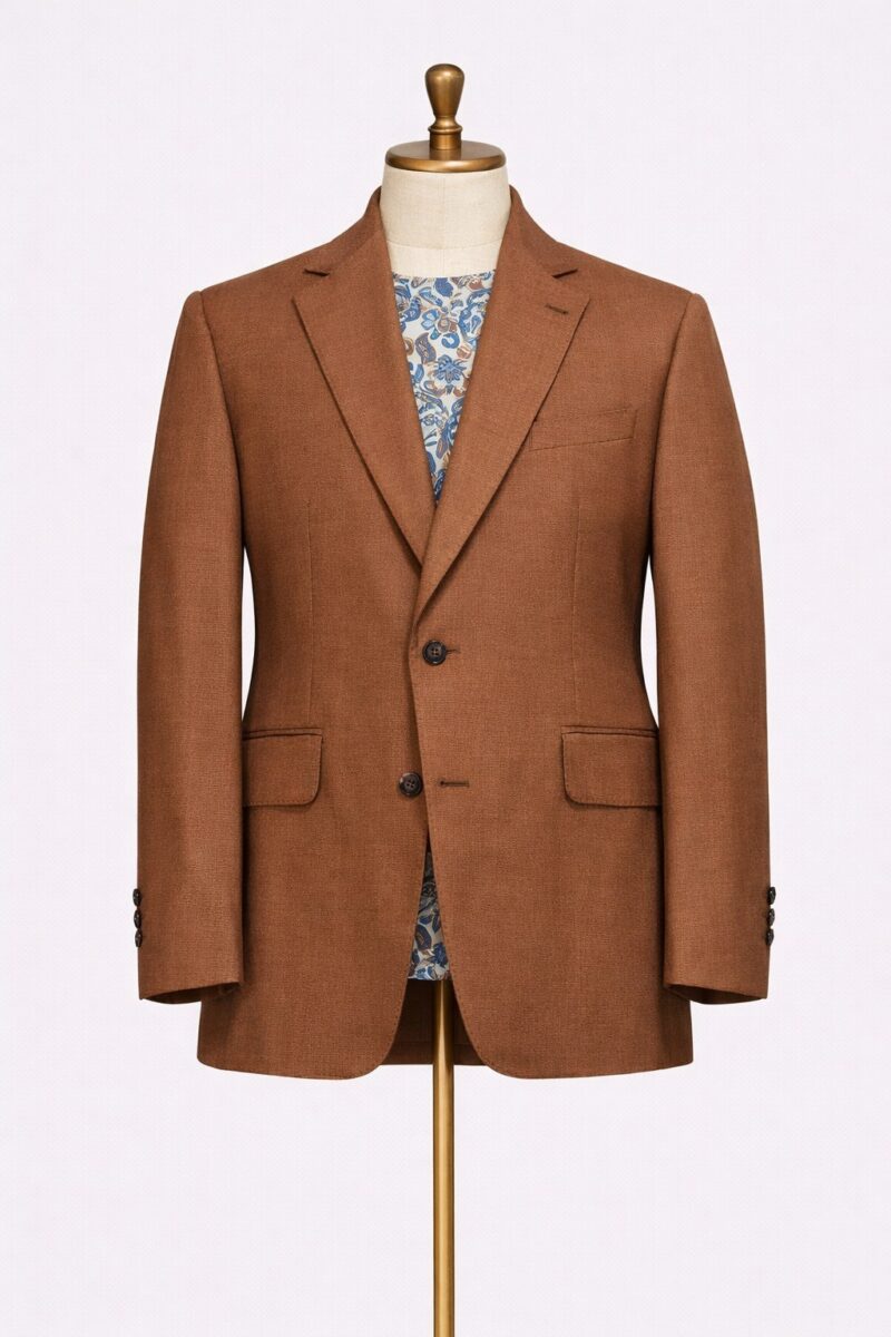 Saco café de silueta clásica que aporta calidez y sobriedad.