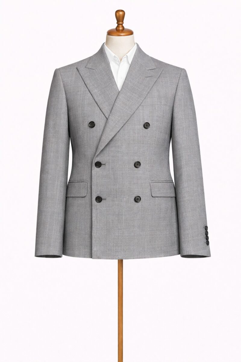 Saco cruzado en gris claro que proyecta elegancia suave y refinada.