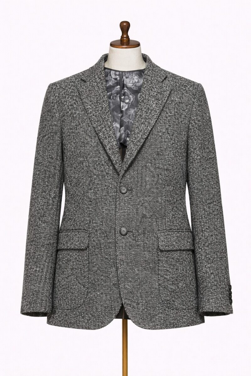 Saco en tono cenizo con textura de lana y una estética refinada.