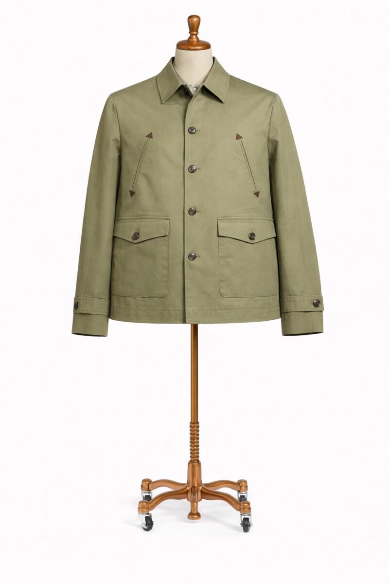 Safari jacket verde oliva con esencia utilitaria y acabado elegante.