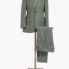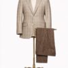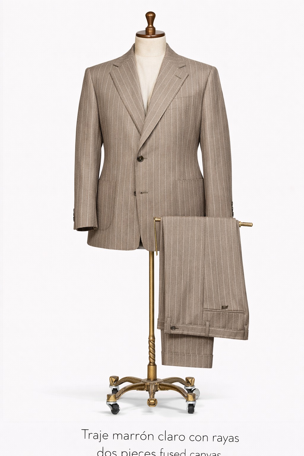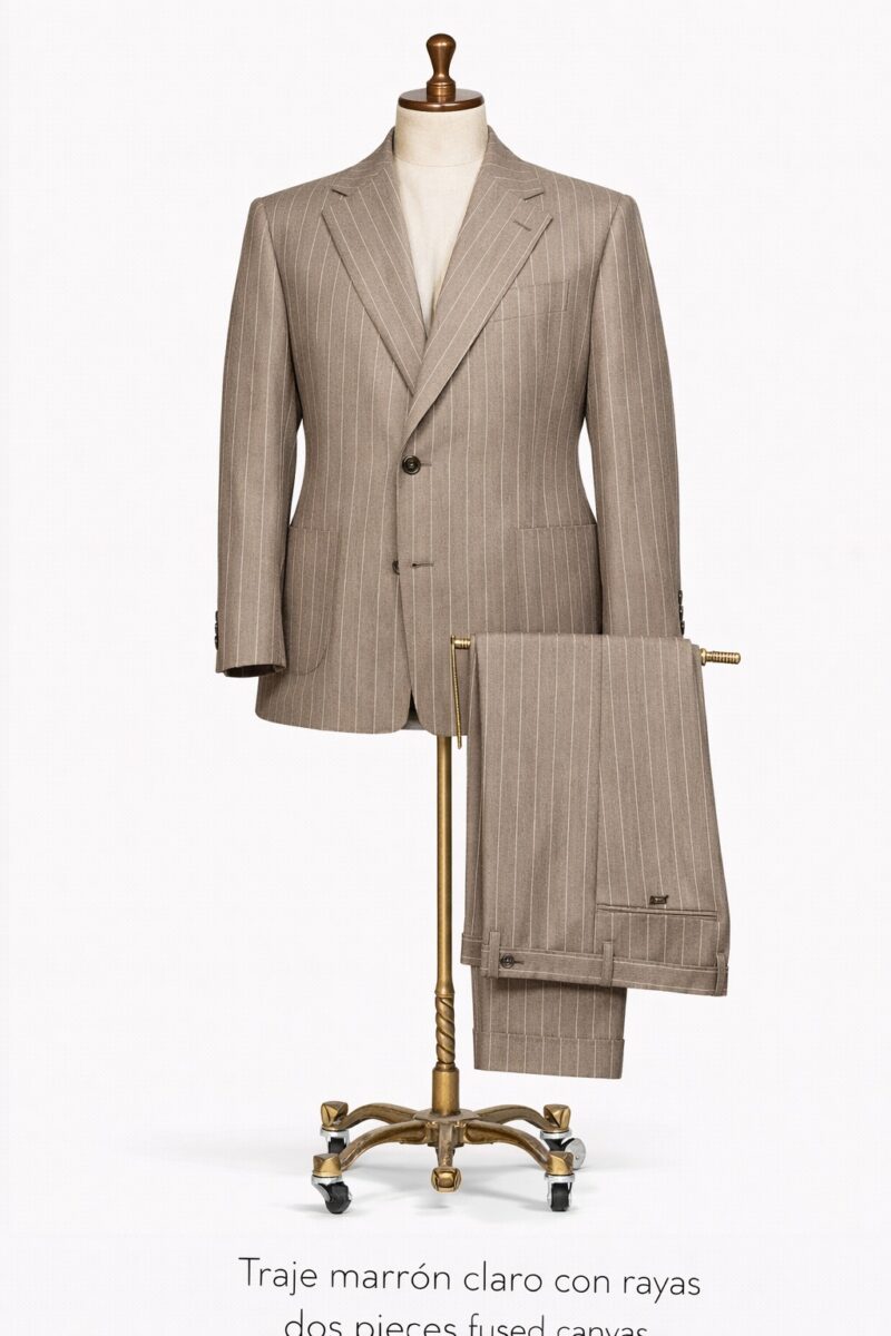 Traje café a rayas con textura de lana y una elegancia clásica.